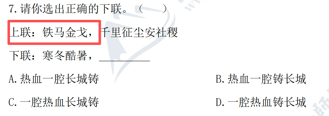 原題:74. 上聯(lián)是“鐵馬金戈衛(wèi)疆土”,最適合的下聯(lián)是( )。