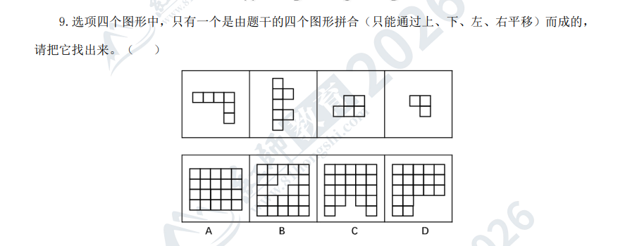 26-95.可由下列五個圖形只經(jīng)上、下、左、右平移而不經(jīng)旋轉(zhuǎn)、翻轉(zhuǎn)拼合而成的圖形是( )。