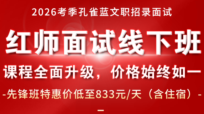 2026軍隊文職面試備戰(zhàn)已進(jìn)入關(guān)鍵階段,當(dāng)不少考生還在為面試班的昂貴學(xué)費(fèi)猶豫時,紅師教育已率先打響一場誠意滿滿的“價格戰(zhàn)”——先鋒班特惠價低至833元/天,且含星級住宿。遠(yuǎn)遠(yuǎn)低于市場價!但是真正讓無數(shù)人選擇紅師、信任紅師的,是那套經(jīng)過8年沉淀、貫穿教學(xué)全程的面試培訓(xùn)“殺手锏”。