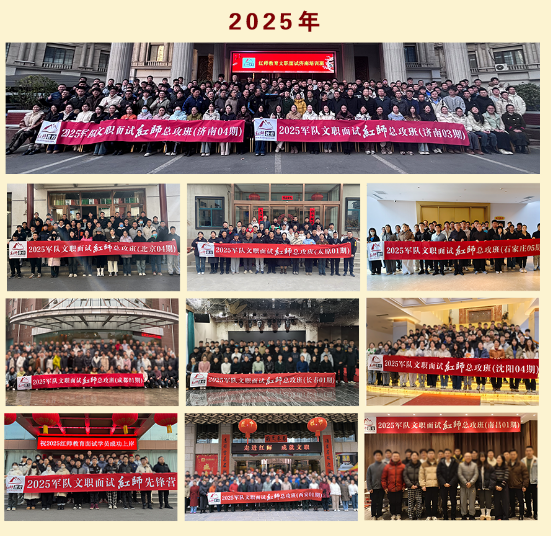 紅師并非市場的后來者。自2018年軍隊(duì)文職首次面上社會(huì)公開招考以來,紅師便已投身文職培訓(xùn)領(lǐng)域,成為國內(nèi)最早開展相關(guān)培訓(xùn)的機(jī)構(gòu)之一。宣傳圖中逐年排列的開班合影,不僅是時(shí)間的刻度,更是實(shí)力的見證: