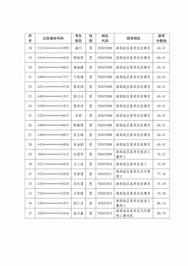 2025年武裝部文職人員擬錄用名單(含上岸分?jǐn)?shù)線) 2025-10-09