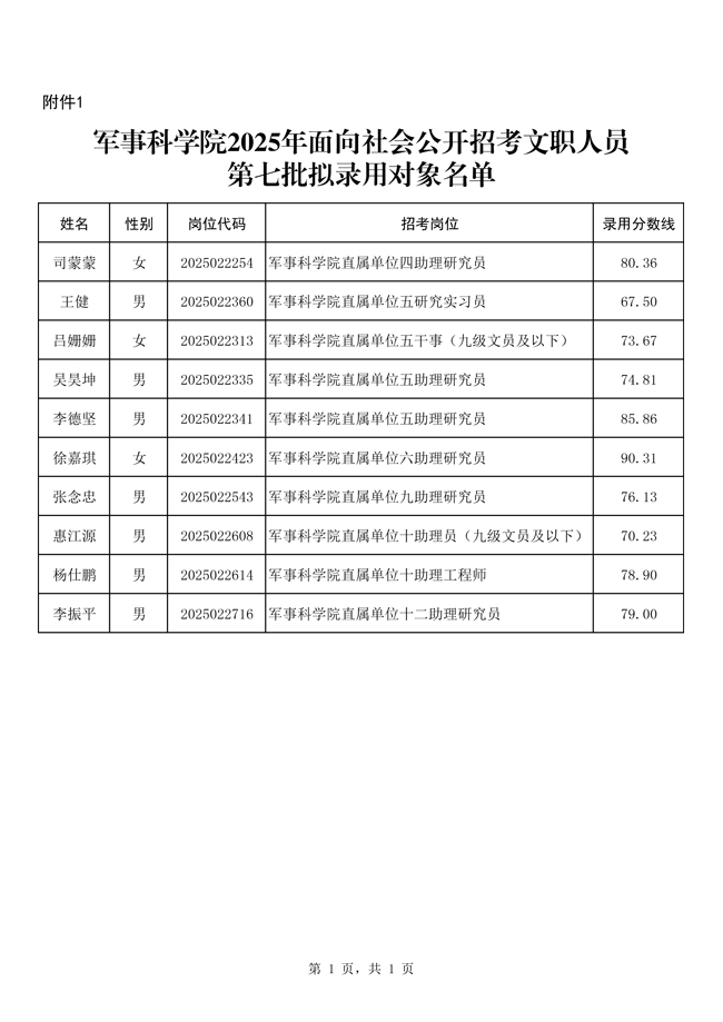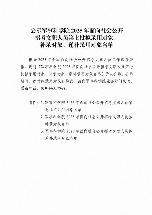 原文標(biāo)題:公示軍事科學(xué)院2025年面向社會公開招考文職人員 第七批擬錄用對象、補(bǔ)錄對象、遞補(bǔ)錄用對象名單