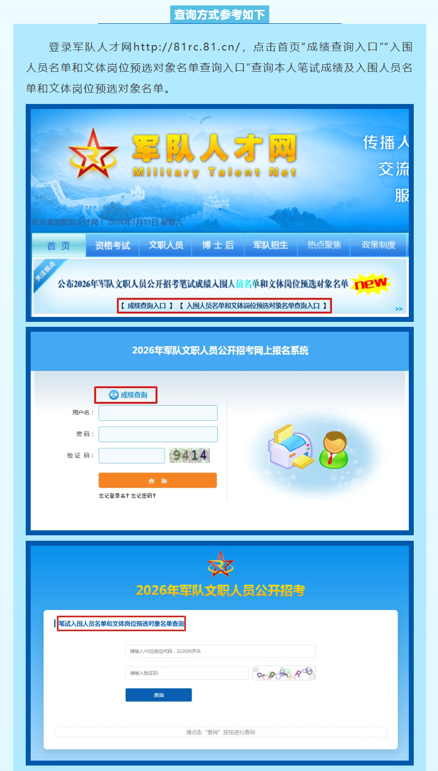 近日,2026年軍隊(duì)文職人員公開(kāi)招考筆試閱卷評(píng)分工作已按計(jì)劃完成。考生可于2026年1月31日8時(shí)至2月6日18時(shí),通過(guò)軍隊(duì)人才網(wǎng)首頁(yè)“成績(jī)查詢?nèi)肟?rdquo;、中國(guó)軍網(wǎng)微信公眾號(hào)“文職招考—筆試成績(jī)”、“中國(guó)軍號(hào)”APP“文職招考—報(bào)考跟蹤”或者“八一通”APP“文職招考—報(bào)考跟蹤”欄目,憑用戶名和密碼查詢本人筆試成績(jī)。