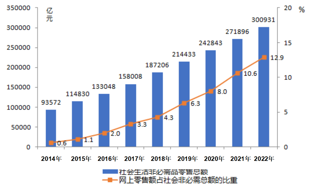 96. 與2014年相比,2022年網(wǎng)上社會(huì)生活非必需品零售總額約翻了( )番?