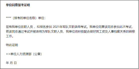 2024年軍隊文職面向社會招聘的對象為高校畢業(yè)生和社會人才,其中有很多的社會人才是在職備考。在職人員報考軍隊文職須得單位同意,并開具《單位同意報考證明》。