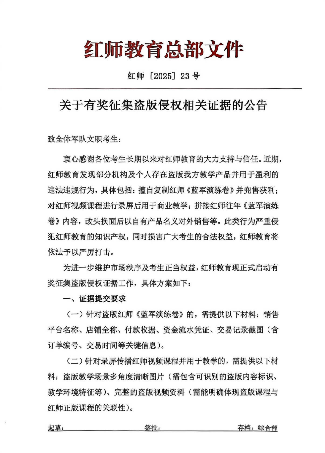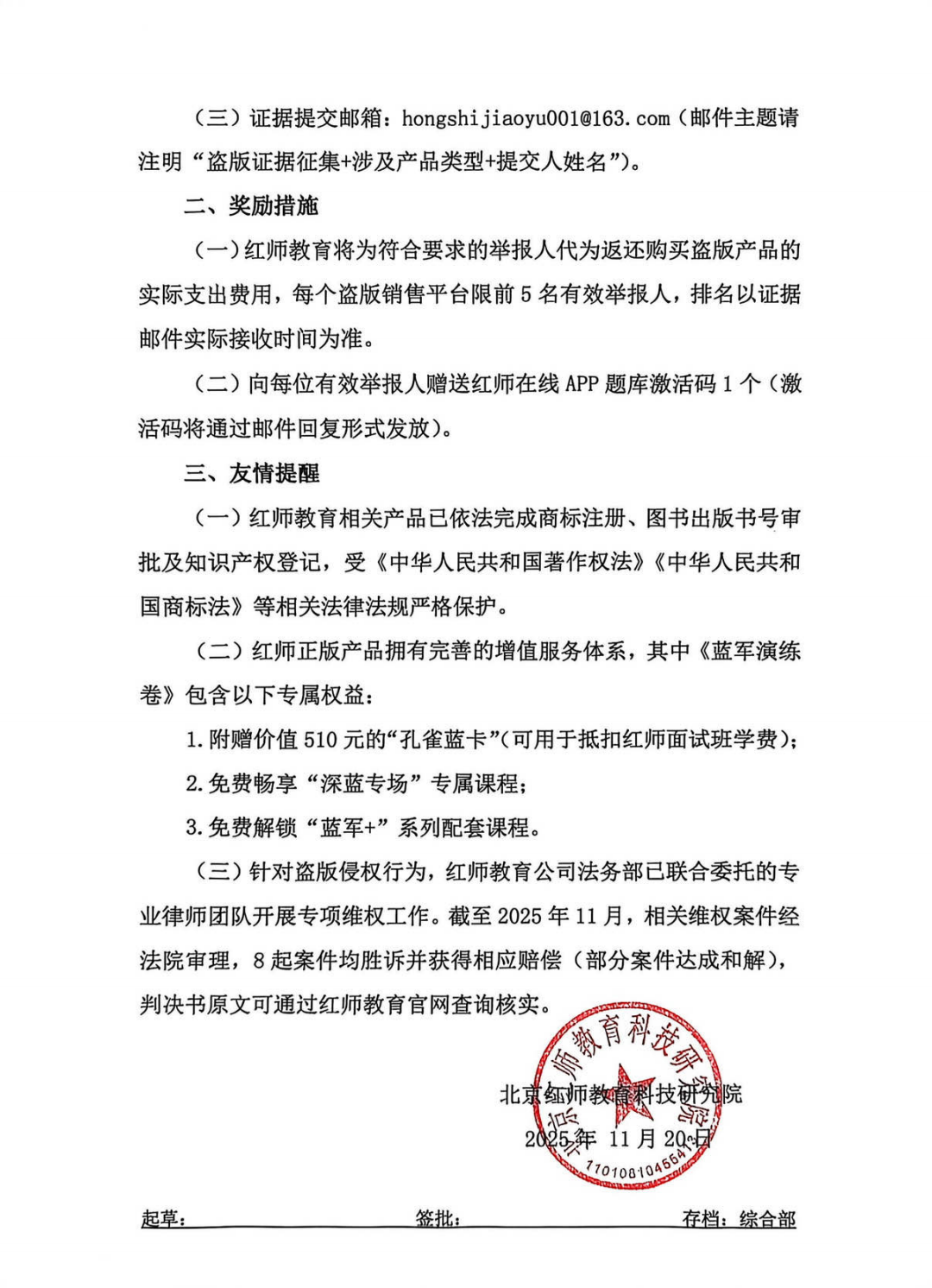 紅師教育丨關(guān)于有獎征集盜版侵權(quán)相關(guān)證據(jù)的公告 2025-11-25