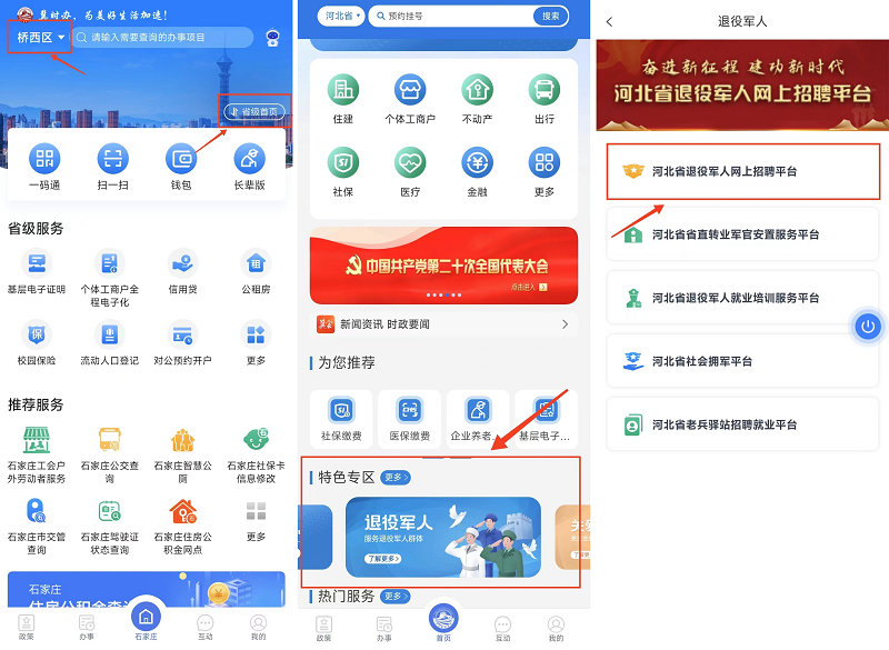 登錄冀時(shí)辦APP后,點(diǎn)擊右上方“省級(jí)首頁(yè)”或左上角定位選擇“河北省”進(jìn)入河北省首頁(yè),在首頁(yè)[特色專(zhuān)區(qū)]點(diǎn)擊“退役軍人”進(jìn)入“河北省退役軍人網(wǎng)上招聘平臺(tái)”(如圖)。