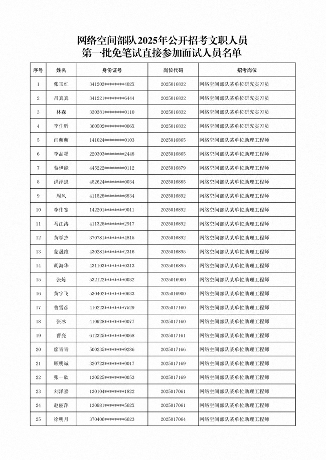 原文標(biāo)題:公布網(wǎng)絡(luò)空間部隊2025年公開招考文職人員 第一批免筆試直接參加面試人員名單